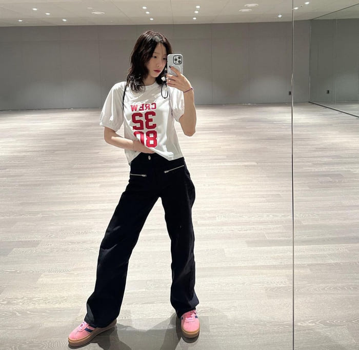무대와는 다르게 평소에는 포인트가 있는 편한 의상이나 컬러로 포인트를 주시고 크롭 한 기장의 옷들로 키가 커 보이는 코디를 하시는 거 같아요!
