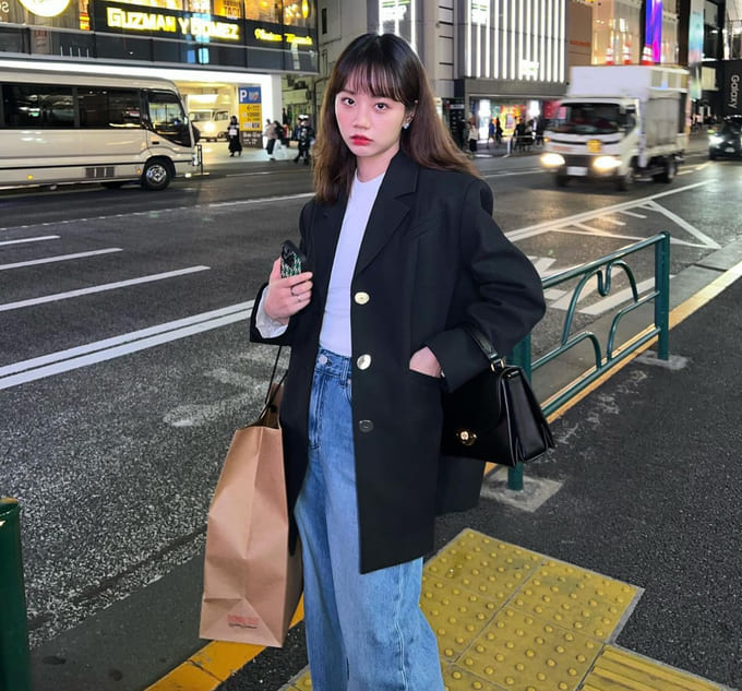 블랙 재킷과 흰 상의 그리고 청바지는 실패할 수 없는 필승 조합이죠! 재킷이 베이식한 핏이 아닌 오버핏으로 핏에 옷의 따라 주는 느낌이 조금씩 다르다는 걸 볼 수 있어요!