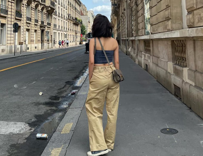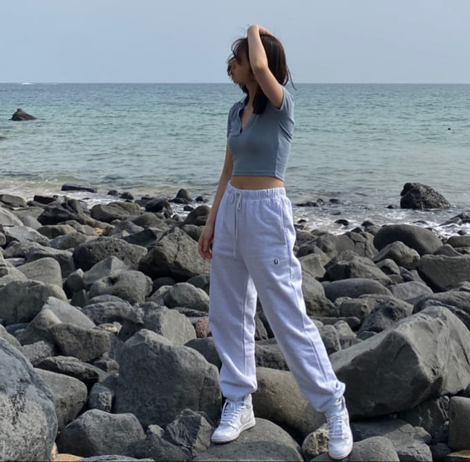 탑 상의를 비슷한 컬러인 청바지와 매치할 때와 베이지톤의 와이드 핏의 바지와 매치할 때와 느낌이 다른 거 같아요. 베이지 톤의 와이드 팬츠가 조금 캐주얼한 느낌이 드는 거 같아요!