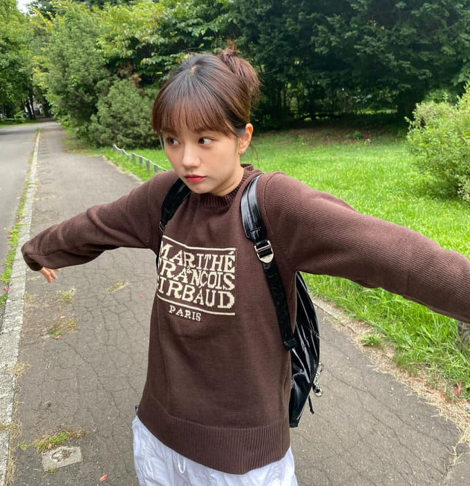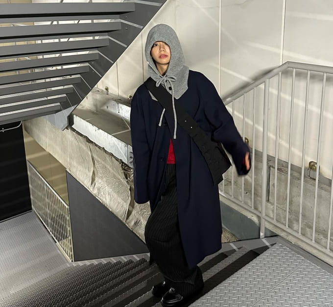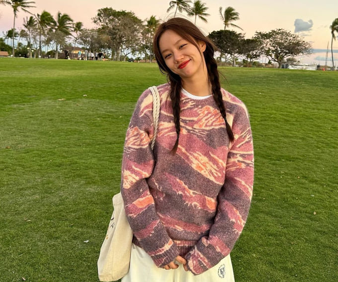 니트에 패턴에 있는 컬러 중 하나와 비슷한 계열의 팬츠를 선택하여 동 떨어져 보이지 않고 자연스러움을 추구하는 코디를 많이 하시는 거 같아요.