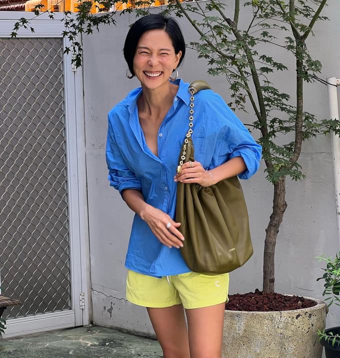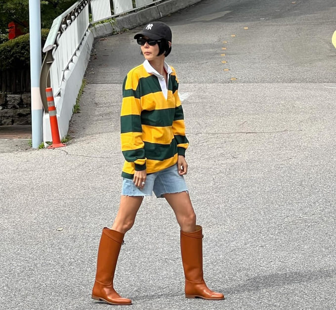 무스탕 와 와이드 하프 팬츠의 조합이 너무 신선하네요! 베이지, 브라운컬러에 레드와 블랙 컬러를 더한 코디! 이런 컬러 조합도 너무 잘 어울려요.