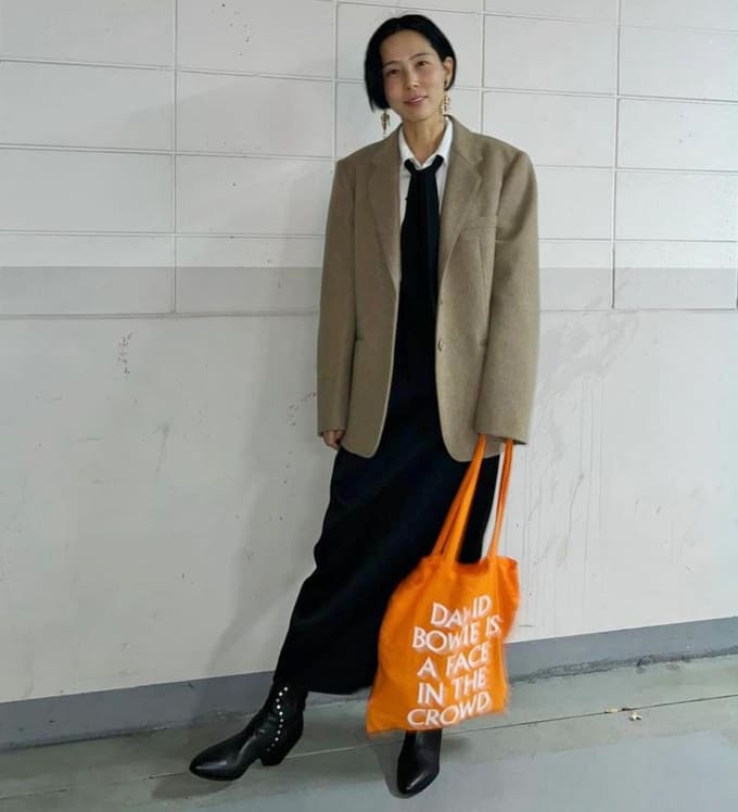 블랙과 베이지 계열의 코디에 오렌지컬러의 가방을 매치하여 포인트를 준 코디입니다. 안 어울릴 거 같지만 너무 잘 어울리는 오렌지컬러와 블랙, 베이지컬러 코디예요.