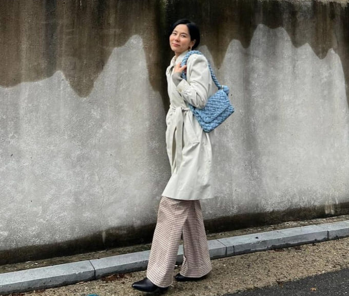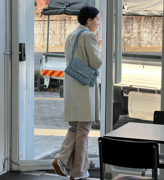 체크무늬가 들어간 바지와 밝은 톤의 가방 그리고 아이보리컬러톤의 간절기 코트, 운동화를 매치하니 캐주얼함이 느껴져요. 여기에서 신발을 구두로 바꿔 신으면 또 다른 느낌이 나는 코디예요.