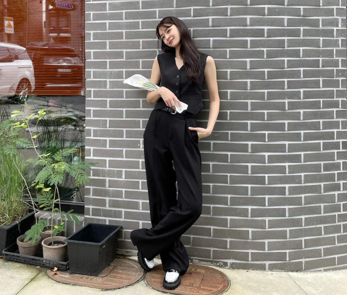 블랙으로 된 베스트 상의와 와이드 한 핏의 바지에 신발까지 블랙으로 코디했다면 다른 아이템으로 포인트를 줘야 하는데 신발을 화이트 컬러로 코디하였어요. 이럴 때는 벨트로도 포인트를 많이 주기도 하죠!