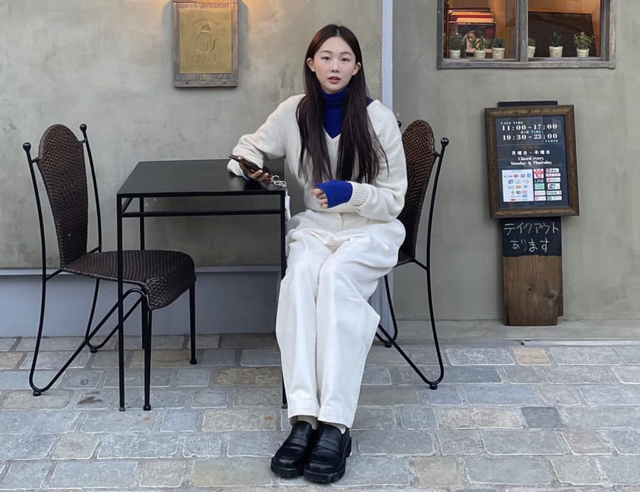 전체적으로 화이트룩에 블루 넥폴라로 포인트 주었네요! 피부도 하얗게 보이는 효과까지 있네요!