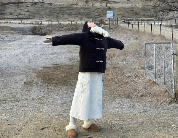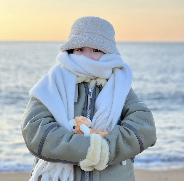 요즘 트렌드 아이템으로 무장한 겨울 패션이네요. 양털모자, 목도리, 재킷에 청바지까지 캐주얼하지만 러블리한 패션이네요!