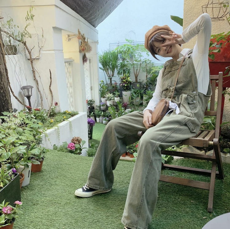 베레모와 멜빵의 조합이 너무 귀여운 거 같네요! 모자와 가방의 컬러를 맞추는 패션센스까지!