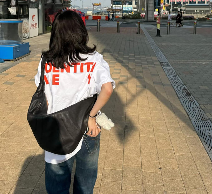 여름에 이만큼 편안 코디가 없는 거 같아요! 레터링 프린팅이 있는 오버핏의 반팔 티셔츠와 청바지! 그리고 가방에 키링까지!!