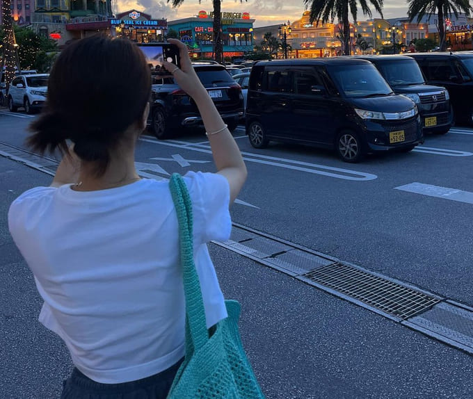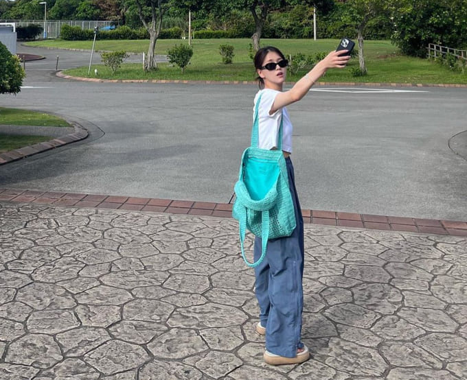 여행 갔을 때 가방을 여러 개 가지고 가는 경우가 잘 없을 때 배우 지은님처럼 계절감이 느껴지는 컬러의 가방 하나로 다양한 코디인 팬츠나 원피스에도 잘 어울리는 코디가 가능하다는 거! 저 가방 너무 탐나는데요?