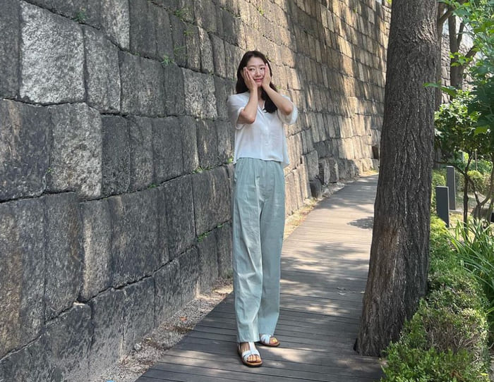 파스텔톤의 옷이 너무 잘 어울리는 거 같아요! 청청 패션 도전이 아직 어렵다면 상의 재킷을 파스텔 계열의 하늘색의 재킷을 선택하는 것도 좋은 방법인 거 같아요!