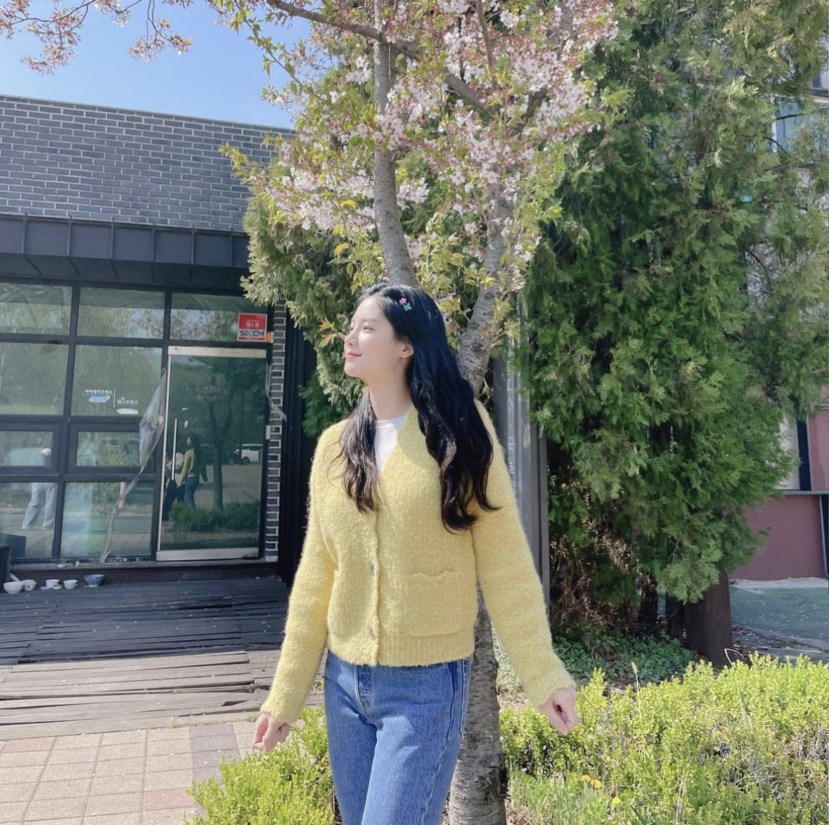 옐로 파스텔톤의 카디건은 간절기 때는 아우터로 겨울에는 이너로도 다양하게 활용이 가능하죠!