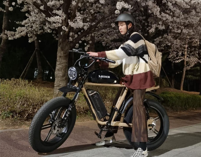 전체적으로 자연스럽게 베이지와 브라운으로 코디를 하고 소재가 독특한 바지로 포인트를 준 바이크 패션!
