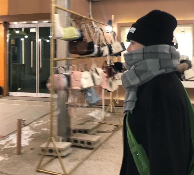 많이들 착용하는 스타일에도 링 귀걸이이나 비슷한 컬러의 모자를 센스 있게 매치하신 인나 님!