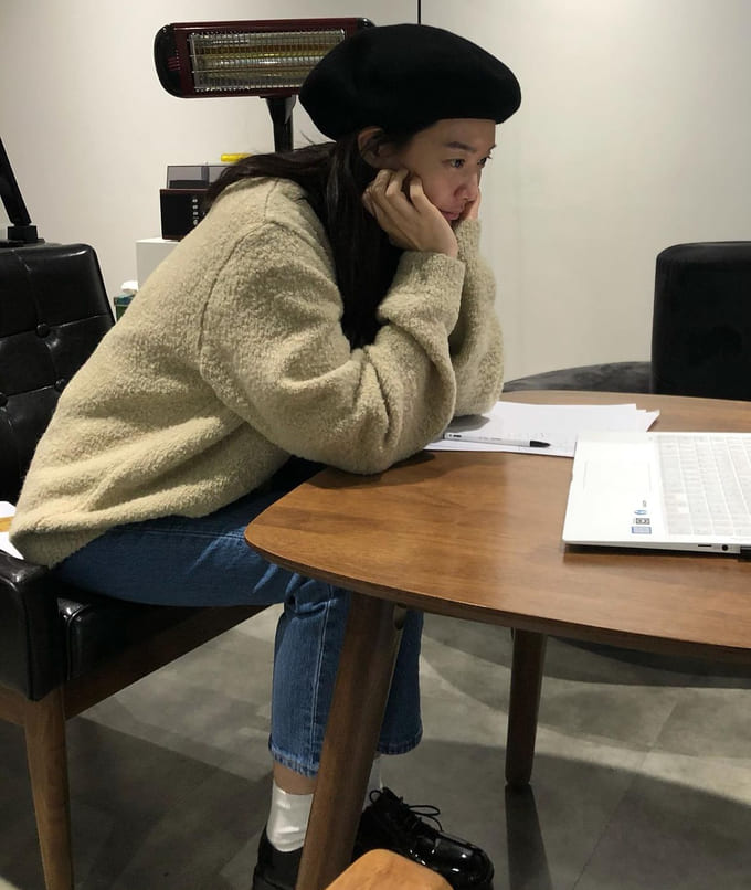 신민아 님의 사복은 편하게 기본아이템들로 주로 많이 코디를 하셨어요. 스카프나 모자를 활용한 코디들도 많았던 거 같아요.