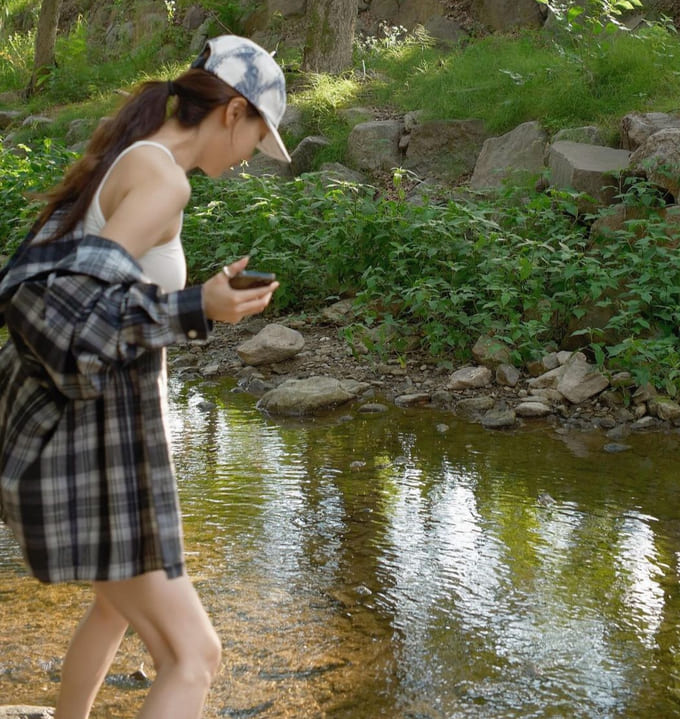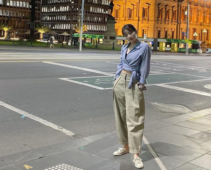나은 님은 항상 코디에 포인트를 주시는 거 같아요! 그냥 셔츠를 착용하는 거보다 셔츠를 묶어 포인트를 주셨어요!