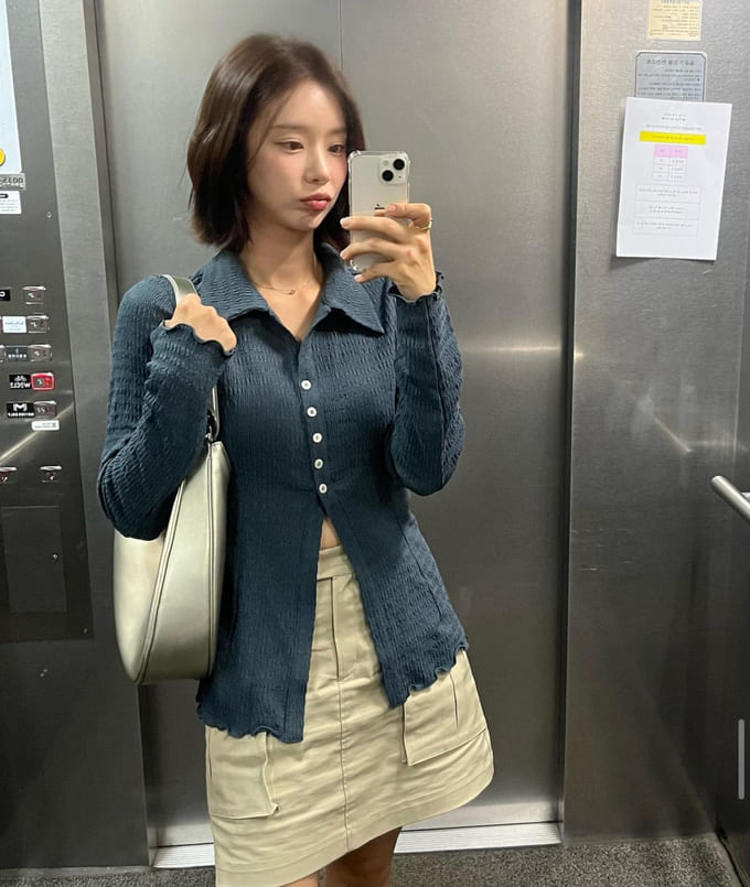 길이가 긴 셔츠를 입으면 허리라인을 가려 일자 허리처럼 보이는데 허리라인에 착 붙는 디자인의 셔츠라 허리가 더 가늘어 보이게 코디를 할 수 있는 거 같아요.