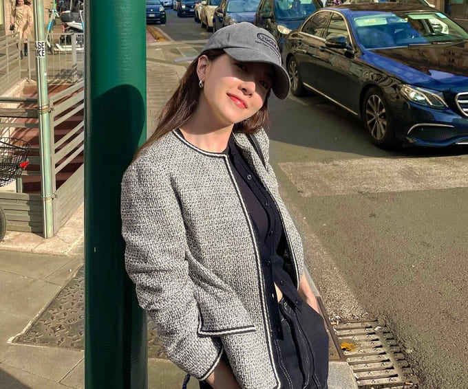 트위드 재킷에도 셔츠가 아닌 이너 카디건과 모자로 캐주얼한 느낌을 연출하셨어요! 컬러감도 전체적으로 무채색으로 하여