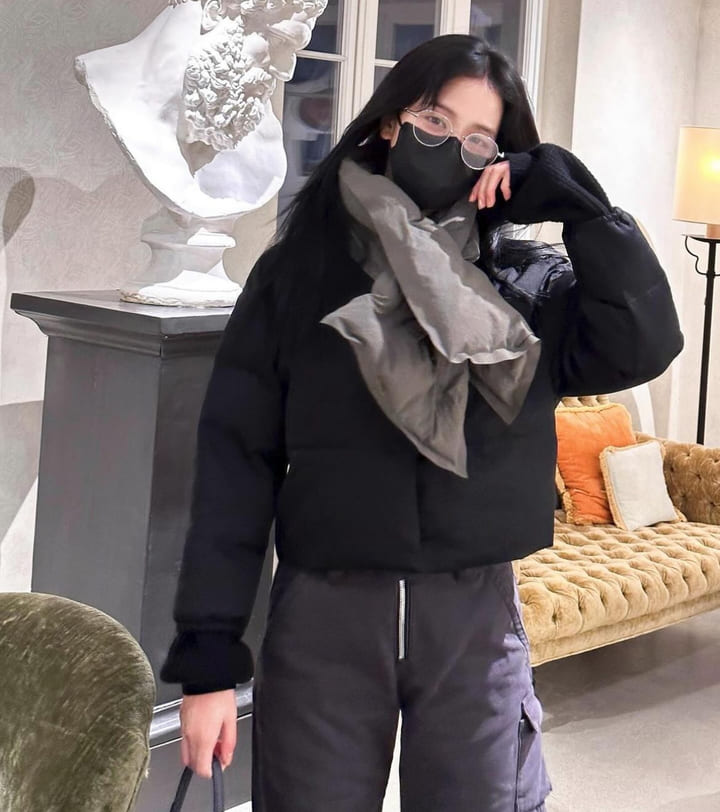 그냥 패딩에 패딩목도리에 카고팬츠를 매치한 사복인데도 패션 아이템을 트렌드에 맞게 선택한 것만으로 굉장히 힙해 보여요!