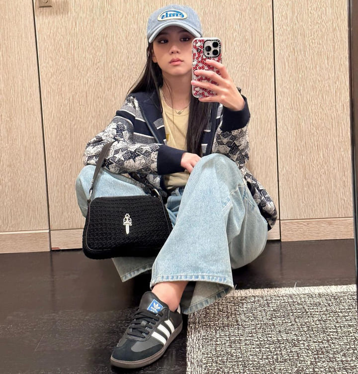 지수 님의 사복을 보면 모자 활용한 코디가 많은 거 같아요! 모자와 청바지의 톤을 맞추고 상의 니트 컬러로 포인트를 준 패션이네요!