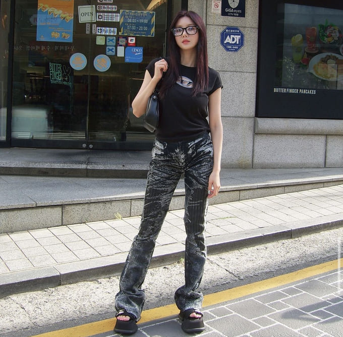 블랙 디젤 반팔 티셔츠에 워싱이 들어가 포인트가 되는 청바지를 매치하고 안경까지 착용하여 Y2K 스타일 같으면서도 시크한 무드가 느껴지는 사복이에요!