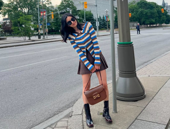 전체적으로 브라운을 바탕으로 코디를 하셨어요! 상의 카디건 패턴 컬러에도 브라운 컬러가 들어있어 잘 어울리는 거 같아요.