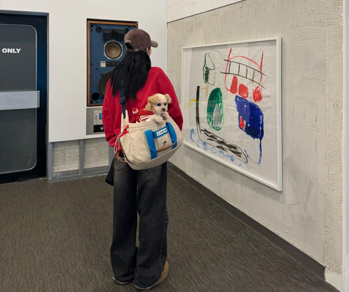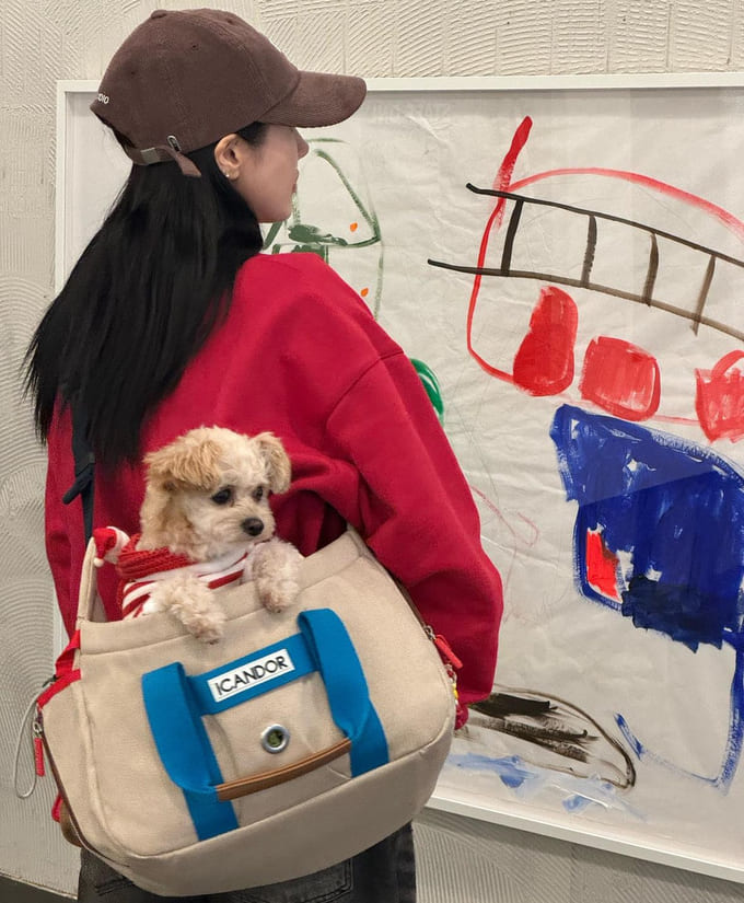 반려견과 커플룩 너무 귀여워요!! 레드컬러 맨투맨에 브라운과 베이지 컬러 아이템들을 매치에 레드의 강렬함을 자연스럽게 만들어주었어요!