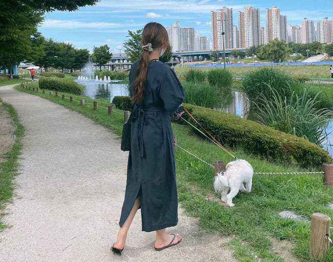반려견과 함께 산책하기에 최고의 룩! 남방셔츠에 트레이닝 바지에서 바지만 연 청바지로 바꾸고 목걸이만 추가했는데도 느낌이 비슷하면서 달라졌어요! 한 가지 아이템만 바꿔도 다양한 분위기로 코디가 가능하다는 사실!