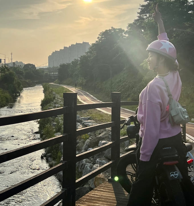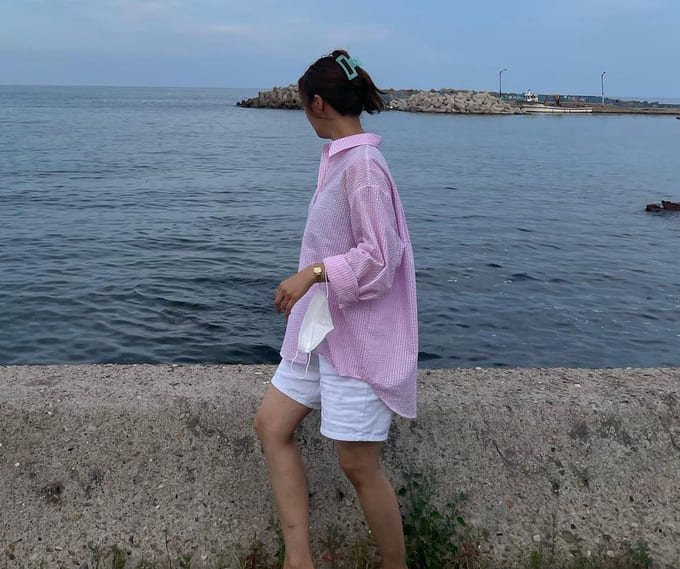 요즘 같이 산책하기 좋은 날씨에는 가볍고 편하게 보미 님처럼 트레이닝 바지에 남방셔츠로 코디!