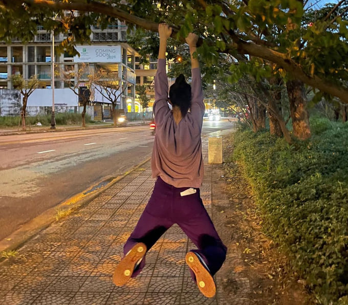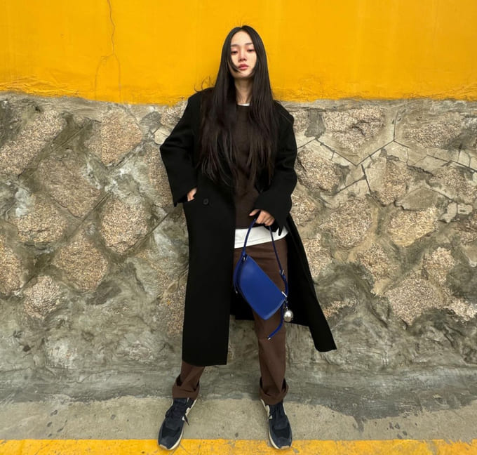 진한 브라운컬러의 트레이닝복 세트와 블랙 컬러 코트를 매치하여 비슷한 컬러로 매치하여 동질감을 주고 운동화를 매치하니 스포티함과 캐주얼함이 동시에 느껴져요!