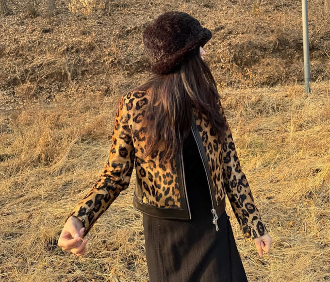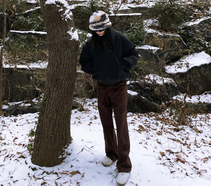 코디의 반 이상은 블랙이 꼭 빠지지 않는 거 같아요! 블랙재킷과 모자 그리고 브라운 컬러의 바지와 운동화로 컬러를 어둡게 통일하고 아이보리 니트를 숄더 카디건으로 밝게 포인트를 주신 거 같아요!