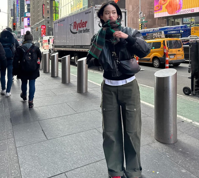 어디서든 블랙 재킷과 청바지의 조합은 성공적이죠? 모자와 선글라스까지 너무 잘 어울려요!