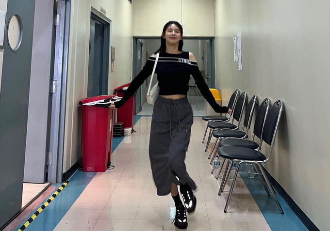 크롭 한 상의와 로우라이즈 팬츠를 매치하여 얇은 허리를 드러내면 더 날씬해 보이는 효과가 있어요! 자신의 장점은 부분을 살릴 수 있는