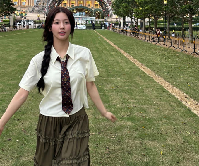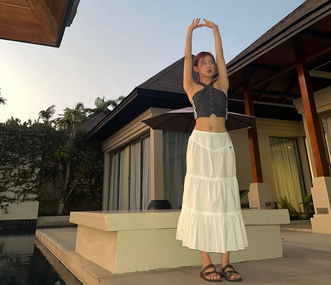 다른 컬러까지도 너무 잘 소화하시는 미연 님! 핑크 가방에 짧은 프릴 플레어스커트!